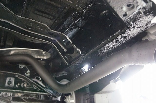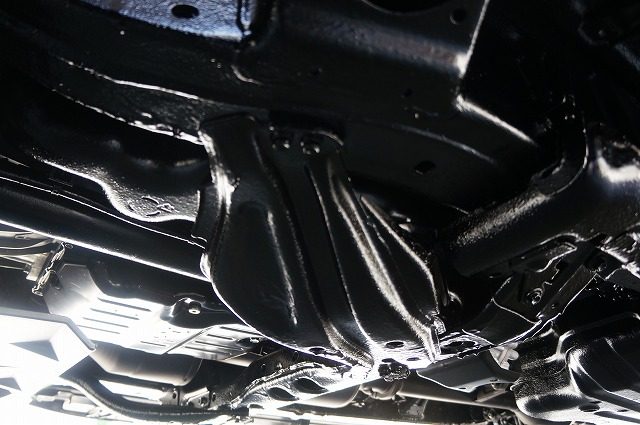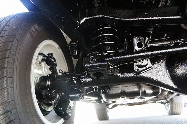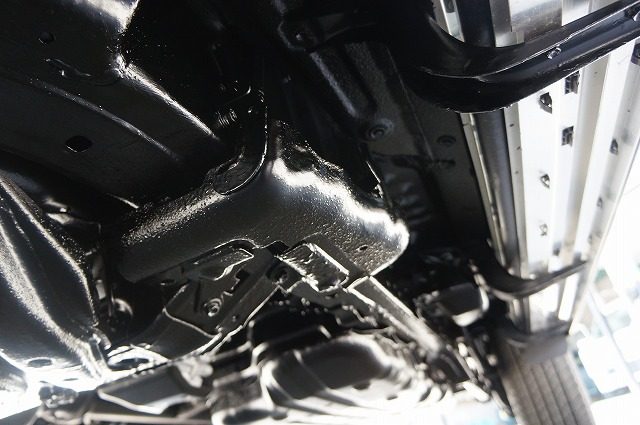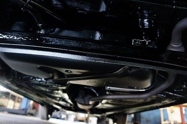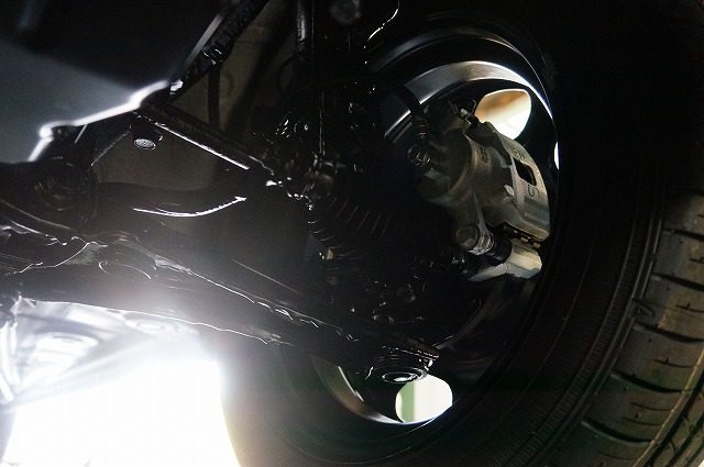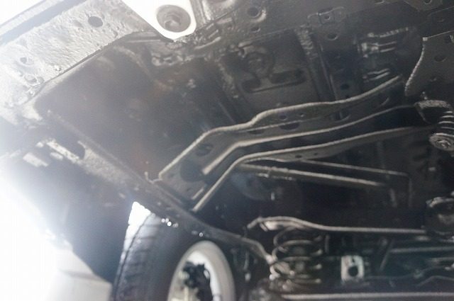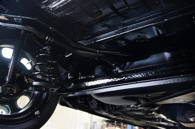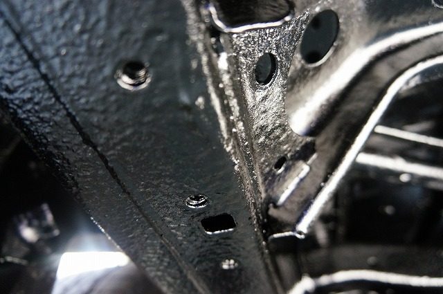 入り組んだパーツもスプリングコイルも隙間無くノックスドールの油性タイプの黒のベールで覆い尽くしました。柔軟性のある強い塗膜は長期間にわたり愛車を錆から守ります。